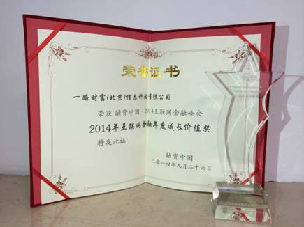 一路财富荣获2014互联网金融年度成长价值奖证书
